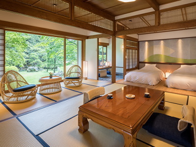 ホテルの機能を備えた老舗宿。バリアフリー構造を取り入れた中央館はプライバシーが保てる広々とした和洋室で、筑後川が一望できます。九州初の畳風呂では、和の風情をお楽しみ頂けます。 |